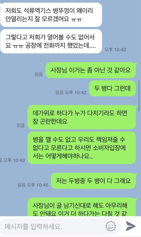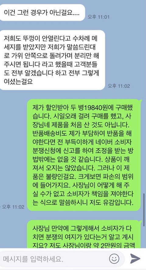 결국 분쟁조정신청을 했고, 1차조정결과에서 판매자가 자기네들은 책임질 의무가 없다고 하고 있고, 네*버에서 저보고 1만 포인트 줄테니 민사종결 하시겠냐고 물었음. 저는 안한다고 2차조정 하겠다고 했습니다. 추가 피해자가 생기면 안되니 판매자가 해당 상품 상세정보에 뚜껑에 관한 이야기를 적어야 하며 환불도 판매자가 19840원을 온전히 다 해야 한다고 의견을 전했습니다.
