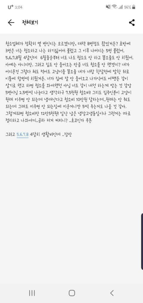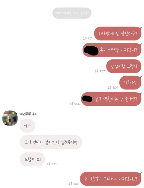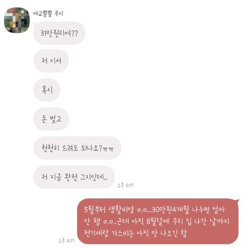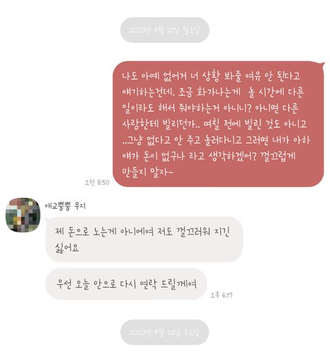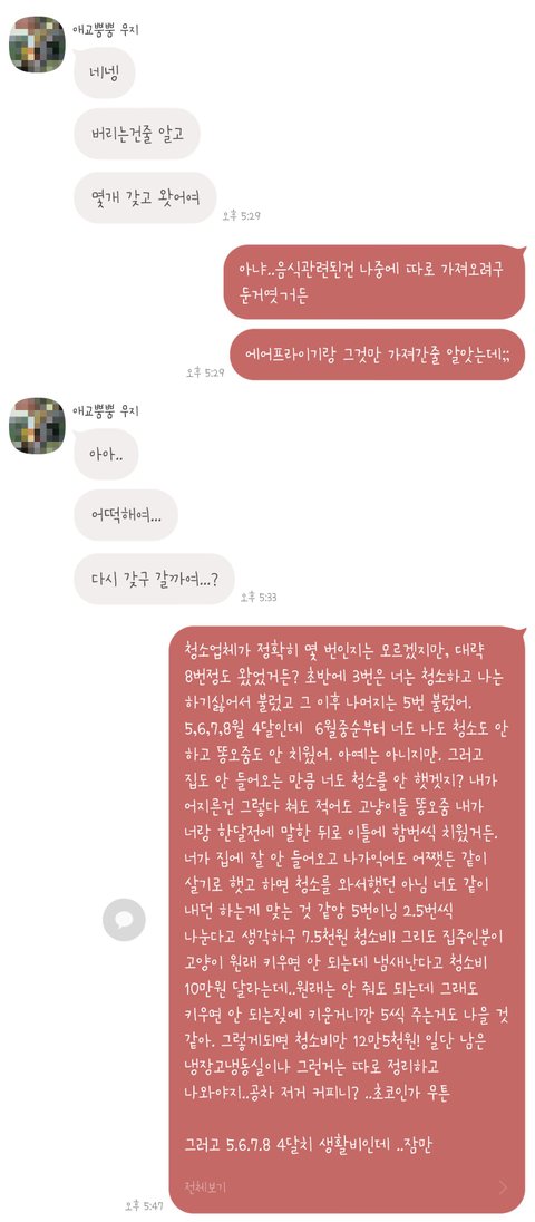 "나한테 지금 싸우자고 하는거지? 원래 이런애였니? 그럼 너가 안 들어오는동안 고양이를 누가 돌봐? 네 고양이를 내가 돌봐? 모레값이랑 사료값은 어디서 나와? 너가 마시는 물은? 애초에 내가 생활비를 다 달라고 했어? 너가 돈을 못 버니깐(코로나19로 인해) 내가 다 달라고 하는것도 아니고 적어도 줘야할 것만 달라고 하는건데?"