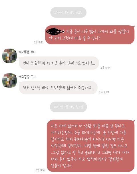 "그때는 너가 일을 하기 전이었잖아. 그리고 나는 지금 현재 돈이 필요한거고."