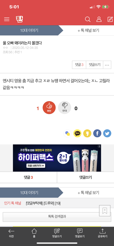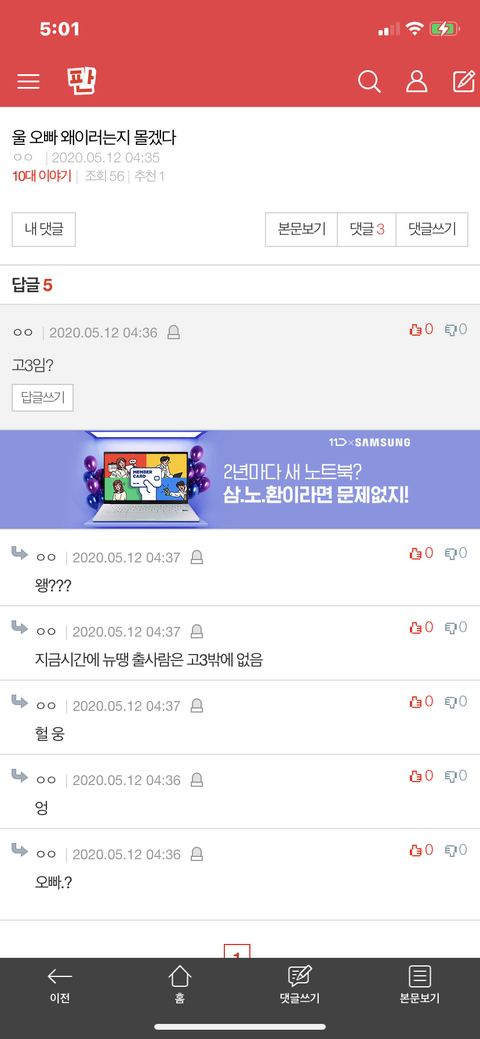 고삼 남자애가 영웅 추는 것도 웃긴데 글쓰니가 고삼드립 이해 못 해서 헐 웅 왱 거리는 것도 웃겨 ㅅㅂ 것도 새벽이네 ㅋㅋㅋㅋㅋ