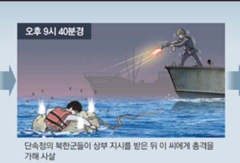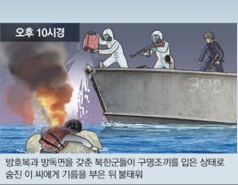 이런개죽음이 어딨음? 더웃긴건 저사람이 저기 있는거 우리나라 군인쪽에서도 알고있었다고함.근데 죽이지는 않을거같에 냅뒀고 6시간만에 북한에서 화형시킨거야.북한눈치보다가 대한민국 국민이 죽었다구