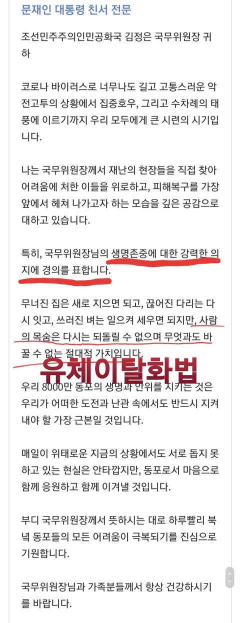 그리고 대통령이 김정은한테 친서 보낸내용중에 .