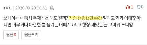 오늘도 저번에 추천받았던 주제로 글 가져와봤어! 아 밑에 댓글 캡쳐본에 아련한썰 풀기도 추천해줬는데 그건 나중에 적을게! 그리고 혹시 보고싶은 주제 있으면 댓글로 적어줘! ฅ^._.^ฅ