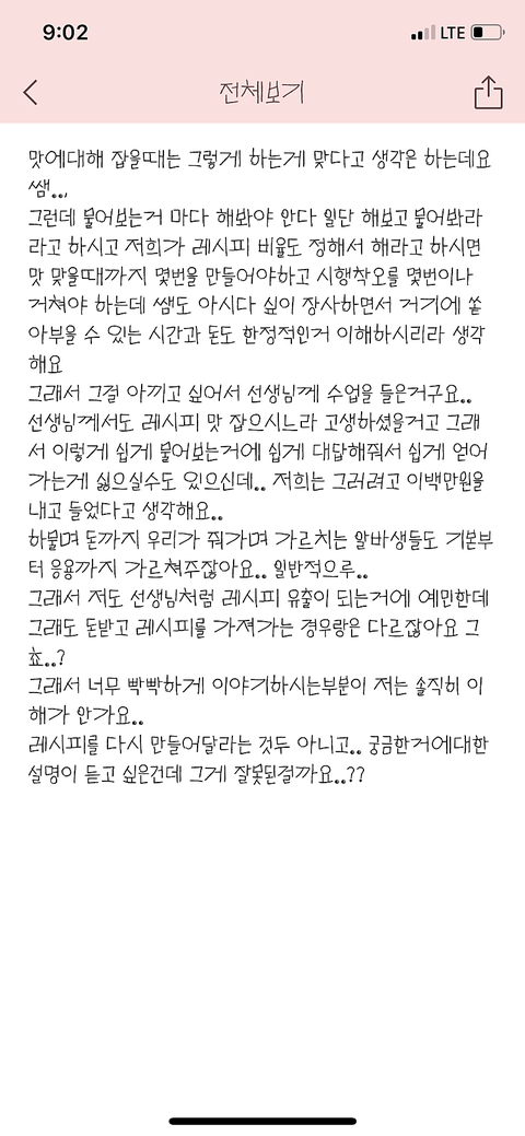 내가 알려준 기본기 다 검사 받기전에는 안준다는 식의 말을 어떻게 할 수 있는지..ㅡ.ㅡ 레시피를쥰다는게 애초에 커리큘럼이었고, 레시피를 쓸지 말지, 더 응용하고 활용할지 말지는 응당한 대가를 지불한 수강생들이 레시피를 받고 후 각자의 결정이지 않을까!!!!