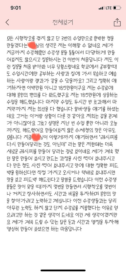 두번째 숙제부터 모르는거나 궁금한거 카톡했는데 겁나 대충 받아치고 다른 수강생 한분한테는 "안바쁜가봐요?"라며 비아냥대기까지함.하... 이쯤되니 나중에 가서 숙제하고 물어본들 제대로 된 레시피와 피드백을 받을 수 있을지 의문이 들음..