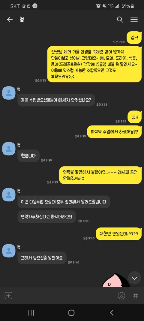 마지막 수업때 선생님은 자신은 죽거나 없어지는게 아니니, 알려준 레시피부터 하.나.하.나. 모두 만들어 본 후에 만든 청을 택배로 보내거나 직!접! 매장으로 와서 맛평가를 받고 피드백을 받은 후 다른 레시피를 받아서 해야 한다고 말함..ㅋㅋㅋㅋㅋㅋㅋㅋㅋㅋ