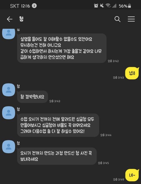밑에는 선생님(흰)과 수강생(핑크) 톡내용