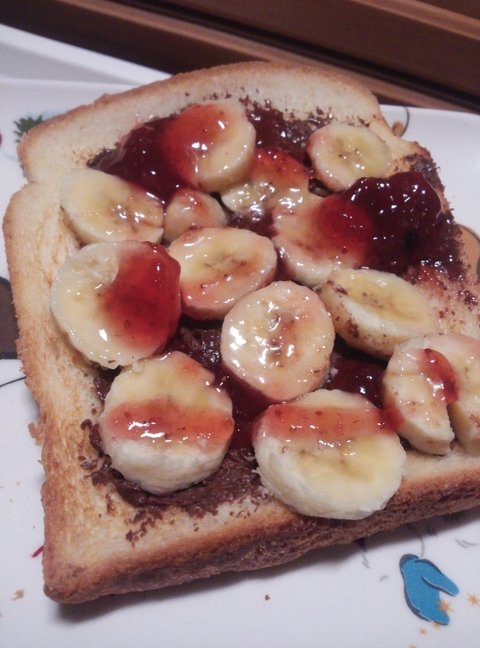 빵 바삭하게 구워서 초코 녹인거 바르고 바나나 올리고 딸기잼 올림 ㅎㅎ