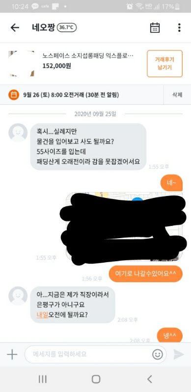 구매자 : 사실 저희 집근처에 파는사람이있다. 그사람은 xx원에 저렴하게 올렸는데 얘(딸)가 xx구에 살아서 사이즈를 몰랐다(그래서 매장처럼 사이즈 알기위해서 저를 이용해서 입어본것.. 이제 사이즈 알았으니 그분한테 사시겠죠)
