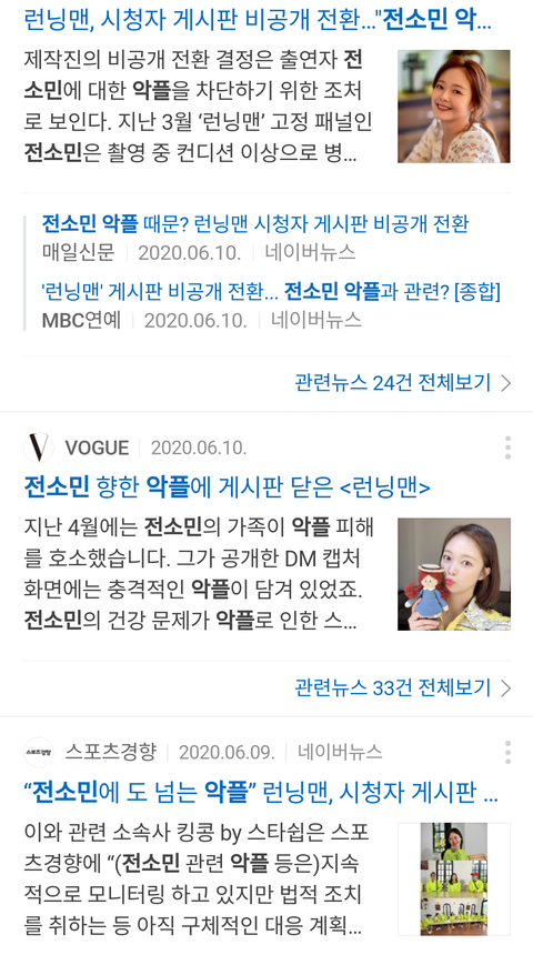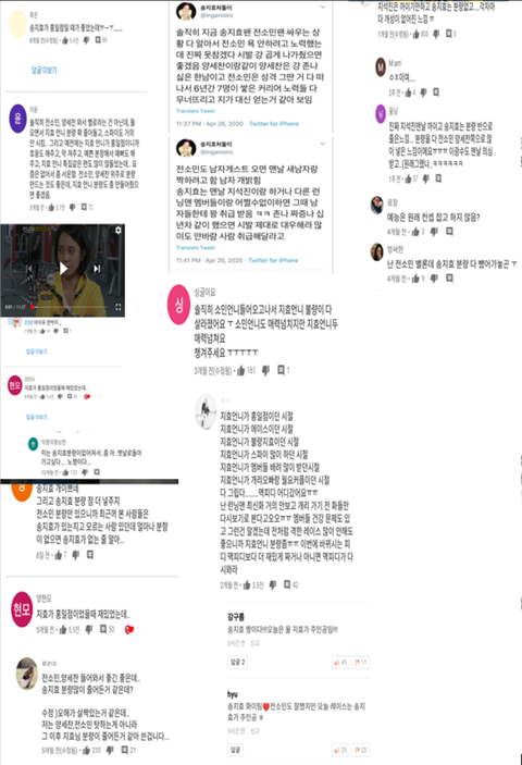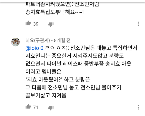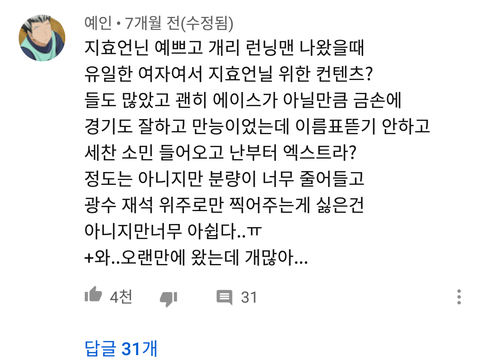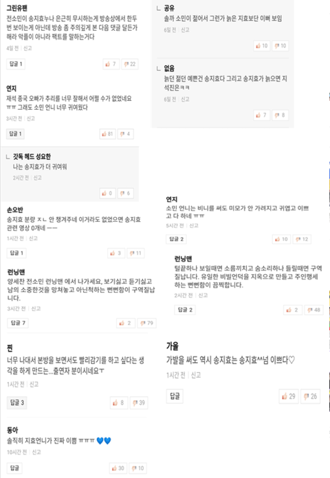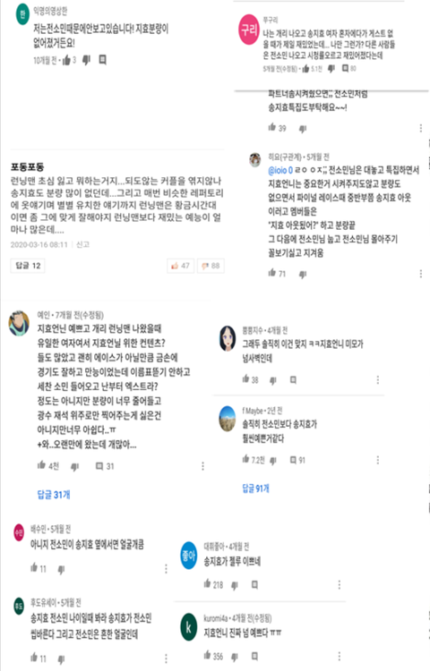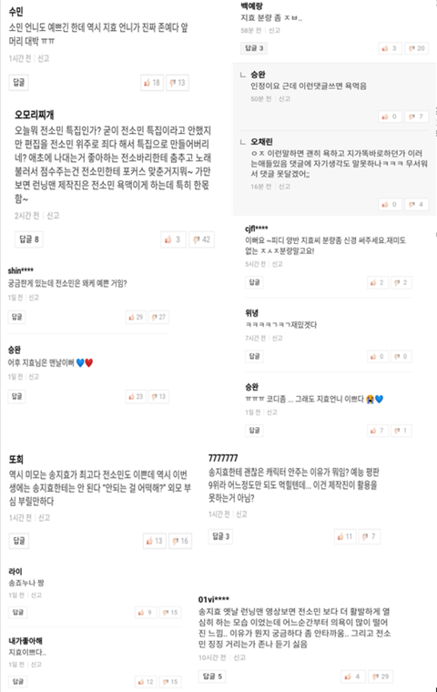 송지효 영상에 매번 달리는 댓글이 송지효 홍일점일때가 좋았다느니 전소민 때문에 송지효 분량 없어졌다느니 전소민 배려한다고 송지효가 적극적이지 않은거라느니 다 이따위 댓글임