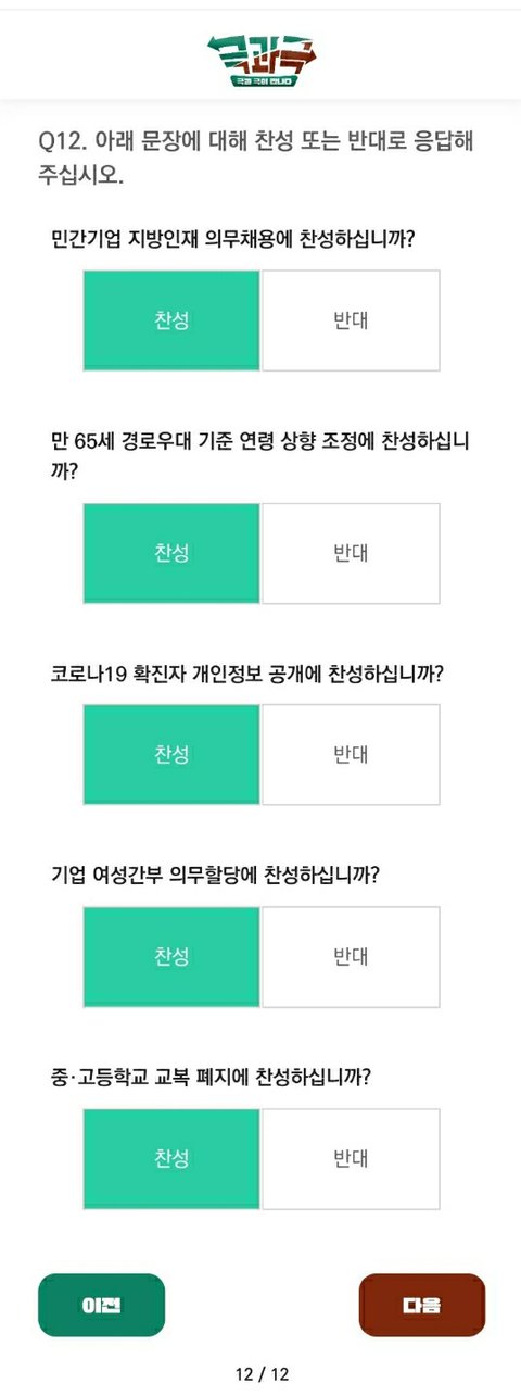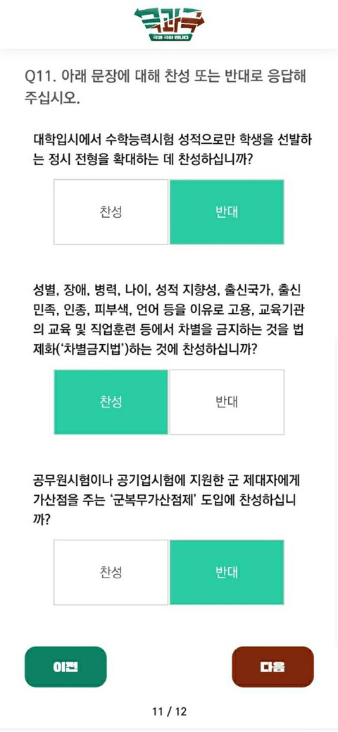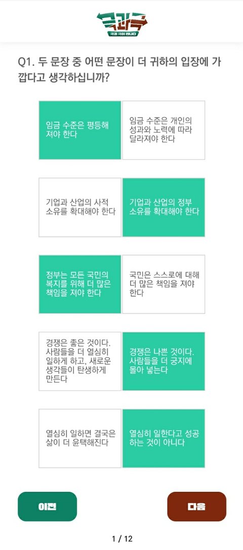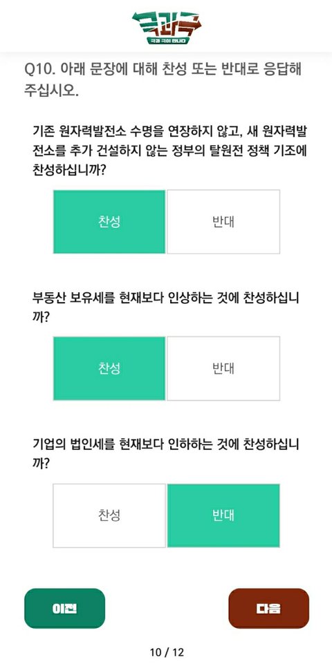 10개 가지고는 판단하기 부족한 거 같아서 직접 저 정치성향 테스트 링크에서 몇 개 가져와 봤어. 초록색이 많은지 흰색이 많은지 세봐