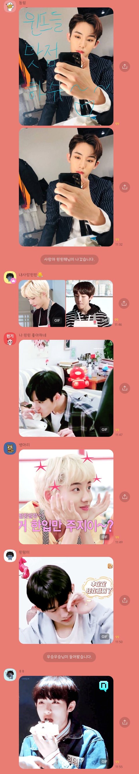 개귀엽다ㅋㅋㅋㅋ 점심 맛있게 먹으라니까 윈윈이가 뭐 먹는 사진 보내줌.. 매일 아침마다 인사하는 것도 넘 좋아... 따뜻해.... 다들 들어와...... 몇자리 안 남앗숴..
