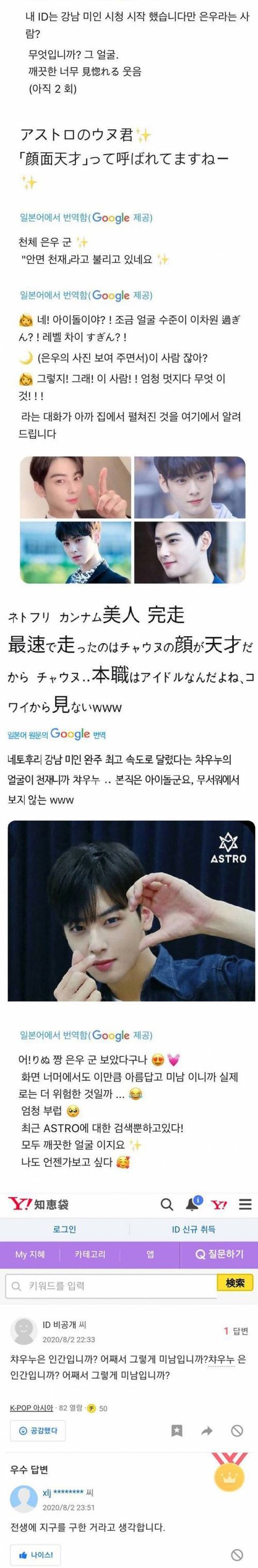 차은우는 서양인들도 잘생겼다고 하더라 진짜 동양인이 나올 수 있는 얼굴중 최대치인것 같음 너무 잘생김