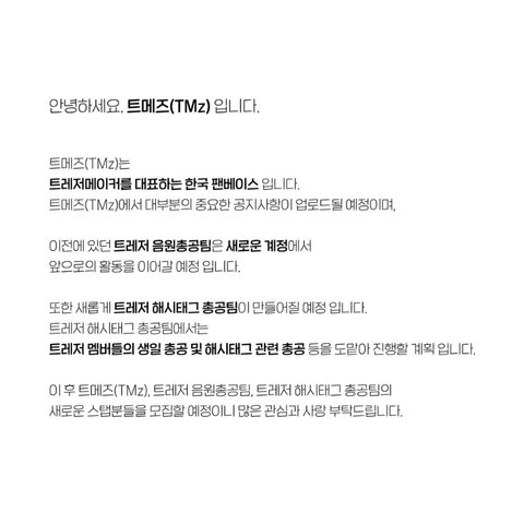원래 음총팀 계정은 '트메즈'라는 이름으로 변경 됐고 음원총공팀이랑 해기태그총공팀 계정팀을 새로 만든대 이미 계정은 있는데 비공으로 돌렸고 새로운 스탭들 뽑겠대 많은 관심 부탁해