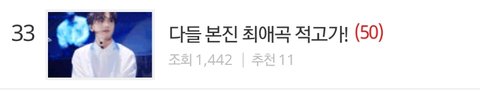 +) 얘들아 실베 너무 고마워ㅠㅠ 나도 도움이 되고싶은데 방법이 없네...댓글에 쓴노래들 중에 모르는 노래들은 거의 다 들어봤어 정말 다 좋더라! 난 왜 수록곡들은 잘 몰랐는지 이해가 안되네ㅋㅋ 따뜻한 말 해준 사람들 다 너무너무 고맙구 다들 행복한 추석보내!