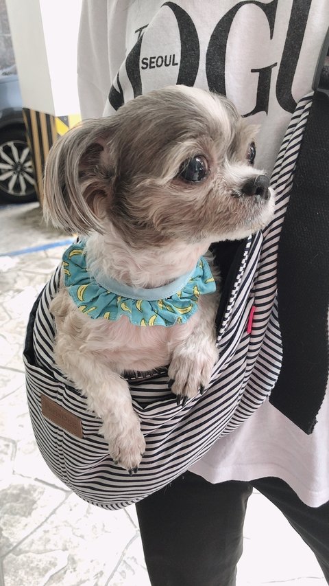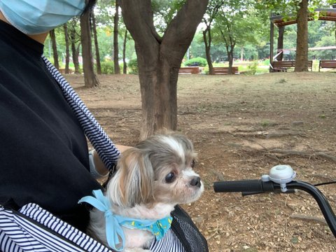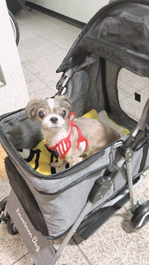 산책나가도 5분걸으면 힘들어해서 유모차나 자전거로 자주 바람쐬어주고 하루에 4번정도 야외소변(필수) 유도하러 잠깐씩 데리고 나가요