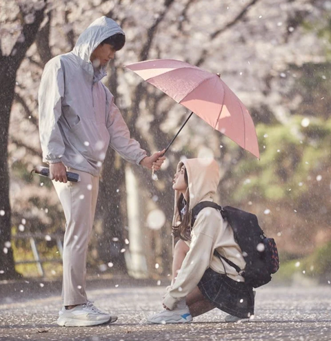 딸한테 핑크 우산을 건네주고 비맞고 가는 아빠