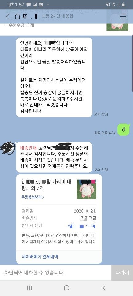 9월 21일 네×버 수산물판매업체 '더 ××'라는 평점도 좋고 구매자들이 많은곳에서 가리비 5kg를 주문 했습니다.