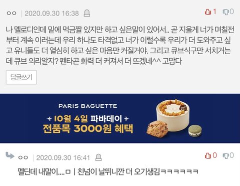 어떻게 이렇게까지 응원하주고 도와줄 수 있지? 아니 우리 어그로에 서치 항상 붙어서 짜증날 수도 있는데 항상 더 화내주고 영업글에는 더 나서서 응원해주고 진짜 우리 글 올라올 때마다 이분들 댓글때문에 마음이 너무 따뜻해.. 우리 나중에 비툽분들 컴백하면 진짜 서로 돕자ㅠㅠㅠㅠㅠㅠㅠ나 펜타건이 큡돌이라 너무 행복한데 이 고마움을 어떻게 표현할지 모르겠음,,