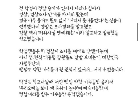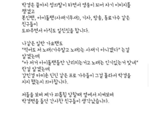 애초에 음악업계 ㅈ도 모르고 돌팬 무시해도 된다는 생각이 깔려있는 거 같음...사재기 시작은 박경이 아니라 제왑(박진영) 등의 음악업계에서도 알아주는 거장들이였고 몇년 전부터 문제였다가 박경 이후로 폭죽처럼 터진건데ㅋㅋㅋ증거도 있고...팬덤 없는 가수라고 뒷배가 없진 않거든..ㅎ학폭 이제라도 터져서 다행인데 인기몰이 좀 하니 핀트 잘 못잡고 막 나가네ㅋㅋㅋ