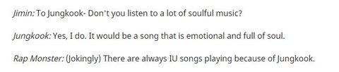 Kpopstarz 인터뷰: 정국이가 매일 아이유 노래를 틀어놔서 멤버들도 아이유 노래 매일 듣는다고 언급