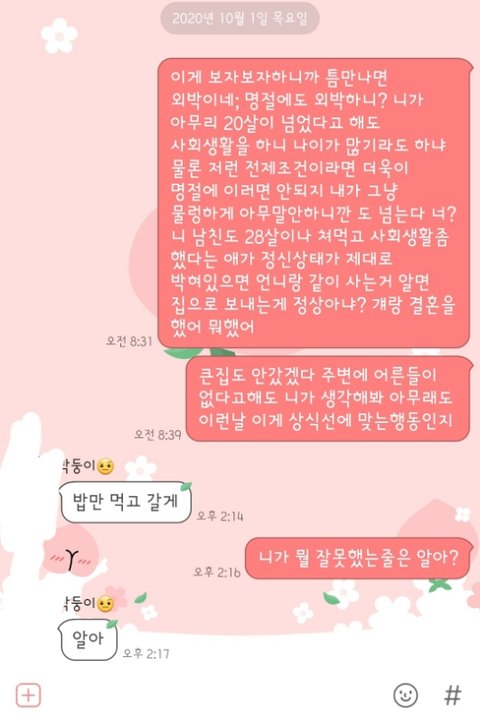 얼마전에 남자친구 생겼다고 데이트도 하고 놀러도 다니길래 좋을때다~ㅋㅋ 하고 넘겼죠ㅋㅋㅋ 이번 명절은 코로나도 있고 어른들이 오지말라하셔서 어디 안가고 집에 있는중이고요ㅜ 근데 어제 저녁 남친이랑 밥먹겠다고 나간애가 아직도 집에 들어오질 않고 있어요;;