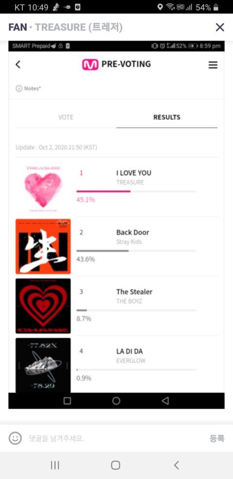 엠카 해외에선 1위야 ㅜㅜ국내투표는 좀 저조해 투표하자 투표는 세번할수있어 트레저한테 세번가능