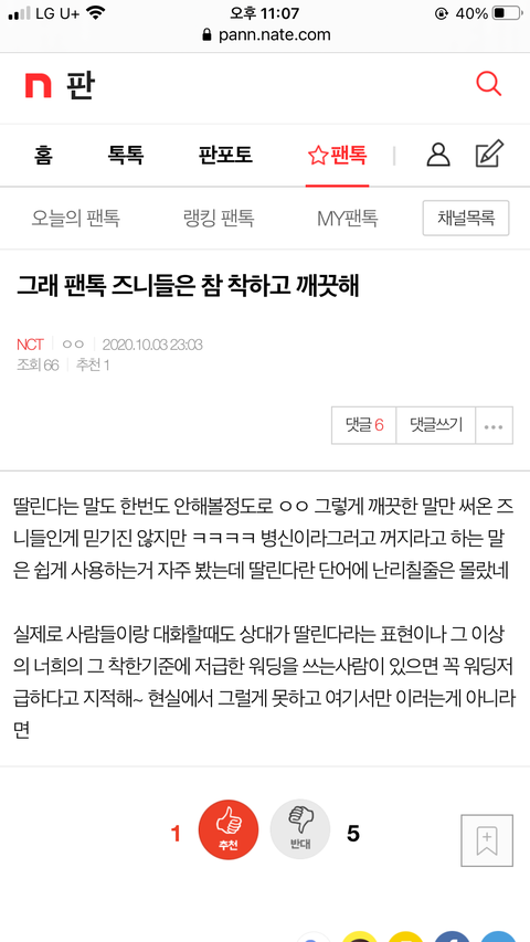 밑에 “그래 팬톡 즈니들 참 착하고 깨끗해” 여기서 봐