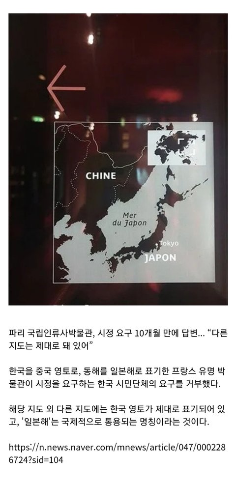 현재 프랑스 국립 인류사 박물관의 지도에 우리나라가 중국의 영토로 표기되어 있습니다. 우리나라 측에서 항의했음에도 불구하고 다른 것은 잘 표기가 되어 있다며 거절했다고 합니다. 이를 해결하려면 네티즌의 힘이 필요합니다.