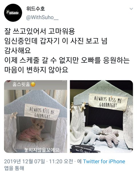 위드수호님 진짜 조용히 사라지셨는데 준면이가 자기네 갱쥐 별이 집 사진 찍어서 올리니까 나오셔서 애들한테 고맙다고, 애기 가졌다고 하시는거 뭔가 뭉클했음... 애들 연차 오래된거 그때 새삼 느꼈다