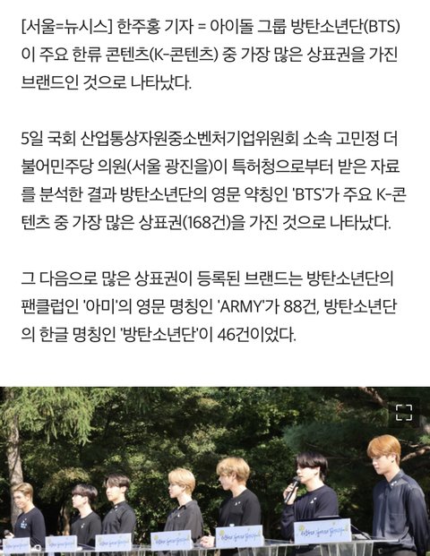 K-콘텐츠 상표권 1위 bts 2위 아미 3위 방탄소년단
