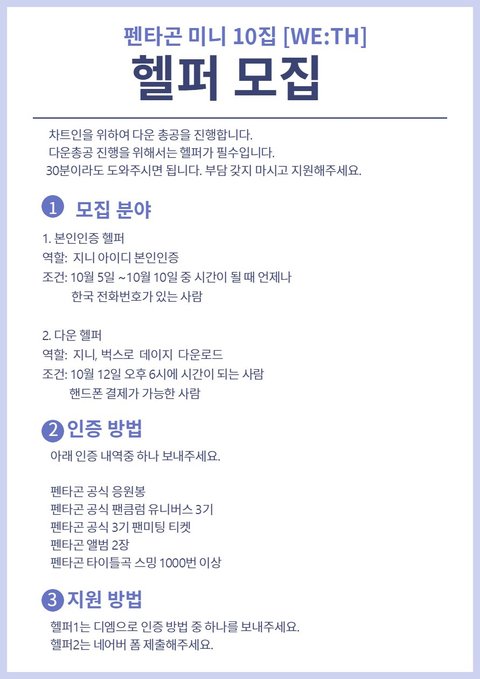 1. 모금액 소액도 모으기 2. 헬퍼 지원하기(가장 중요) 3. 지니, 벅스 아이디 제출 !!!이렇게 인듯 특히 지니랑 벅스는 이메일 다르게 3개씩 생성가능하고 인증 너무 간단하니까 꼭 해주기 바라!!!! 현재 카톡 펜타곤 총공 옵챗 들가면 뉴니들, 유입들도 지원 가능한 방법 설명해줌!!!!! 도움이 많이 필요해