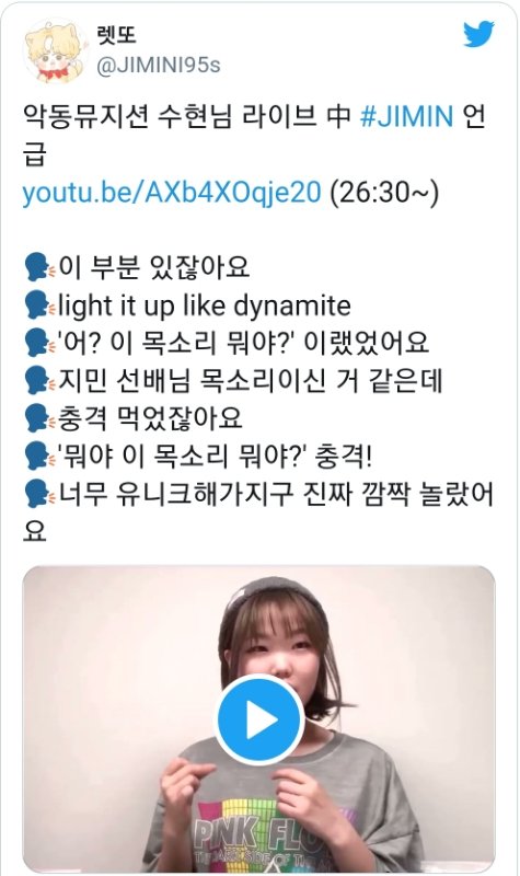 는 지민 브릿지 파트 브릿지의 다나나~light it up like dynamite 이 부분의 음색을 듣고 유니크하다고 생각했다고 함