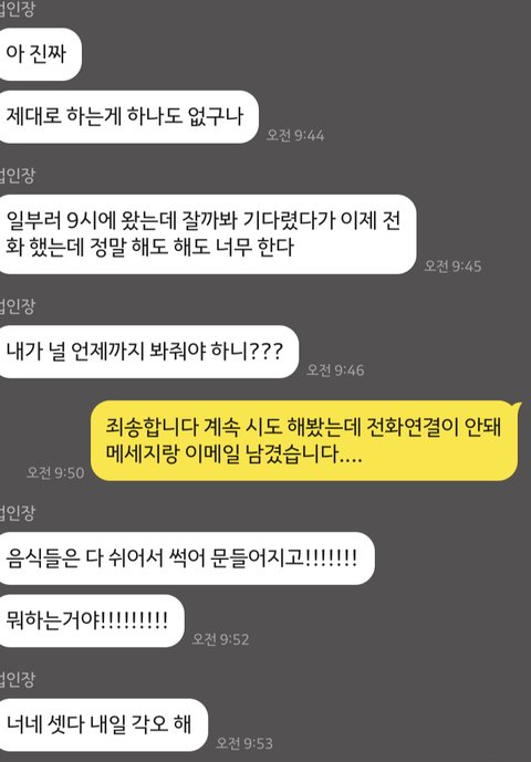 다음날 아침 공휴일날 9시40분에 저한테 전화해서 전기 안들어온다고 지랄하고 도시락 놓고 갔다고 개지랄하고 그래서 제가 베트남어도 못하는데 건물에 전화하고 이메일 보내고 연락해서 50분쯤에 전기가 들어 왔어요.