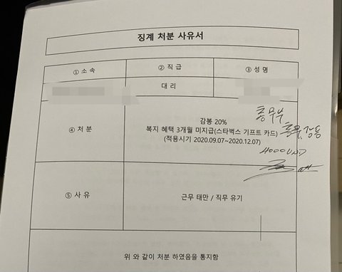 직원들 다ㅎㅎ 점심제공도 안돼고 스타벅스도 안주고ㅎㅎ 도대체 내가 뭘 잘못했는지?