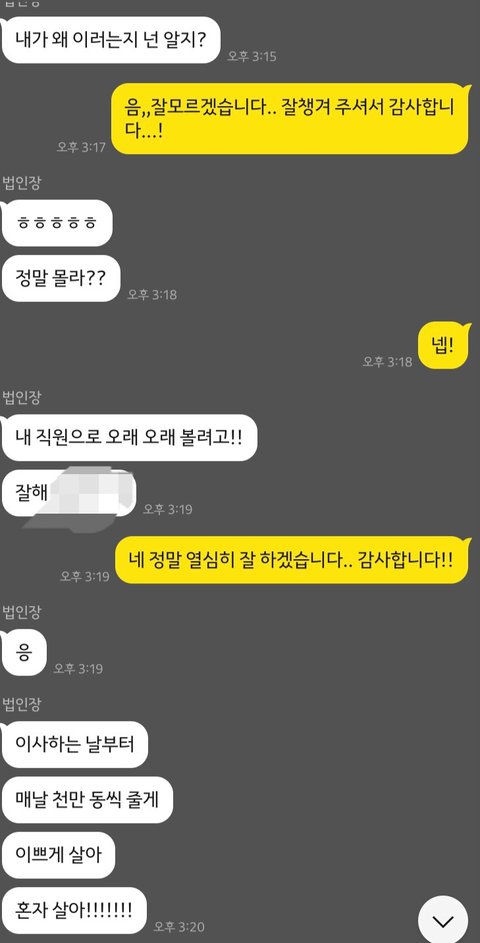 저번에 분명 둘이 밥먹는 일은 없다고 하더니 어느날 오늘 저녁 먹자길래 약속있다고 하니까 야 비서가 무슨 약속이냐고 저녁 같이 먹는것도니 일이라고 개소리해서 무슨 일있냐니까 할말이 있대요 일 얘기냐니까 아니라고 따로 할말 있다고 해서 아니 법인장님 밥먹어도 일얘기 안한다 해놓고 매번 일얘기만 하면서 혼내지 않냐고 하니까 일얘기 절대 안한대 그럼 사적인 자리 아니냐고 사적인 자리는 남자친구가 안좋아해서 안됀다니까 야 진짜 어이없다면서 너 나 질투 하게 할려고 그러냐면서,,, ???????아니 아저씨 질투 받아서 뭐해요 그냥 싫다하면 좀 그만하지 이십분정도 앉혀놓고 계속 먹자하다 계속 거절하니까 갑자기 일 얘기 할거라고ㅋㅋ 그래서 일 얘기면 지금 하세요 하니까 그때서야 됐다고 나가보라 하더니 카톡으로 또 너 짜증나 이러면서 무슨 인터넷 소설쓰세요? 그리고 그날 협박으로 이제 알아서 너 살길 찾아 하더니 다음날 바로 자기가 그렇게 말하던 꼬리칸으로 보냄ㅎㅎ 그리고 회사 사람들한텐 제가 비서 하기 싫다 했다고ㅎㅎㅎ분명 지가 월급깎을때 이제 비서 하니라 총무로 강등됬다고함,, 그게 도대체 왜 강등인지는 모르겠으낰ㅋㅋㅋㅋ