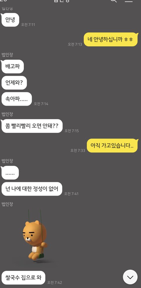 그리고 매번 비서라는거 들먹이면서 아침,점심,저녁을 같이 먹길 바라고 처음에 회사 8시까지 출근인데 매일 제가 40분쯤에 도착하니까 쌀국수 먹으러 가자해서 몇번 갔더니만 한번은 7시15분 쯤에 언제 오냐고 왜이렇게 늦게 다니냐면서 쌀국수 먹게 빨리 오래요.. 저 그날 37분에 도착했는데 진짜 먹기 싫어서 카톡온거 무시하고 53분까지 밖에서 기다렸어요ㅋㅋㅋ 근데 계속 오라해서 결국 쌀국수 먹고ㅎ