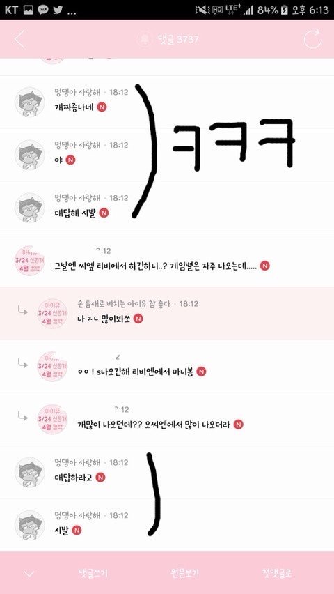 예를 들면, 며칠 전에 승윤이랑 민호 글이 톡선에 올라갔는데 걍 댓글도 ㄱㅊ고 잘 흘러가는데 어떤 놈이 기분나쁜 말 하나 던지고 갔거든? 그땐 걍 짤 같은 거 미친듯이 올려서 그 댓글 밀어ㅇㅇ 저번에 계속 그런식으로 잘 대처해서 조회수랑 추천수 대박났자나ㅇㅇ