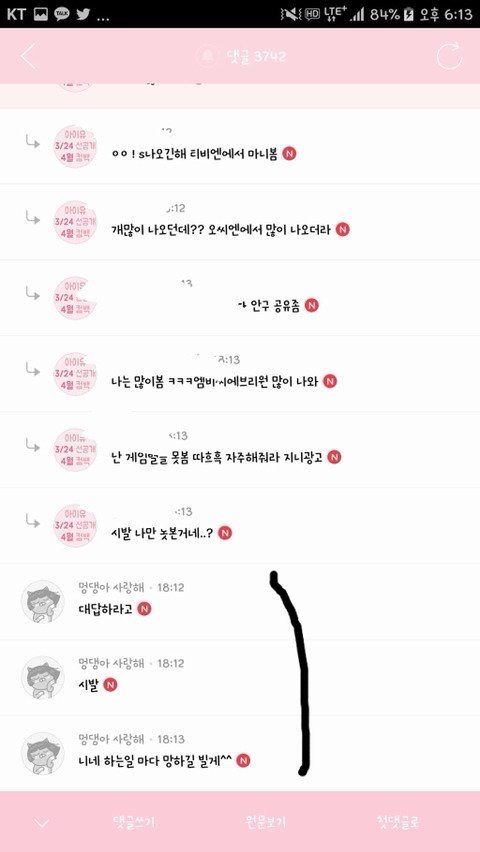 그리고 !!정!!말!! 힘들겠지만 그 어그로 대댓글에 어떤 인서가 'ㅂㅁㄱ'같은 말 써놓으면 하고 싶은 말 있어도 참자ㅠ 나 하나쯤이야 하고 생각해서 ㅁㄱ댓 무시하고 어그로 패면 관심받아서 좋다고 더 날뛰어ㅠ