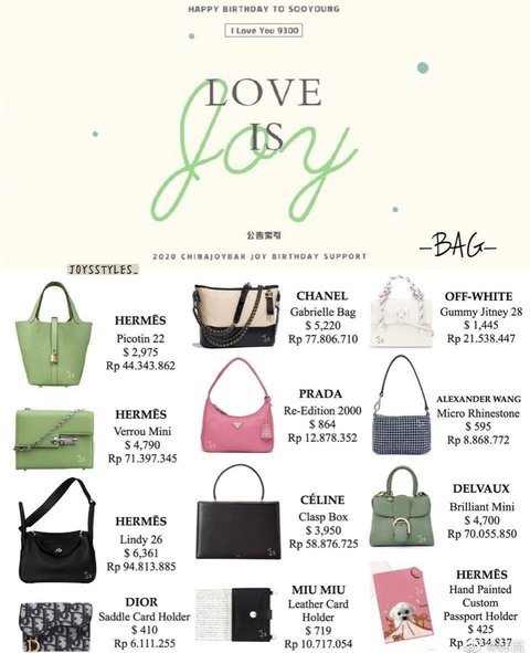 근데 다른커뮤에서 봤는데 조이 생일때 팬들이 조공해주는 선물들 개쩔더라.. 막 700짜리 샤넬백, 프라다백 디올백 에르메스 백 구찌 지갑, 구찌 운동화, 구찌구두 디올 아이패드 맥 뭐 에르메스 지갑 명품 옷 등등 이거 극일부만 가져온거 개부러움 명품 개많을걸 자기 돈으로도 많이사고