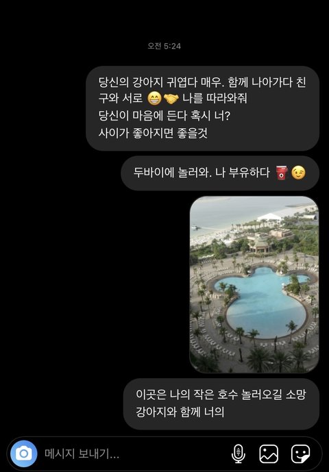 심심해서 혼자 아랍에미리트 사람인척하고 남친 강아지 계정에 저렇게 보내놈 내일아침에 답장 오겠지?ㅎㅎ기대된당