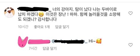 후기는 남친도 완전 깜빡 속았어ㅋㅋㅋㅋㅋㅋㅋ 아랍인이 번역기돌려서 ㅇㅇ이(남친 반려견이름)한테 친구하자고 왔대ㅋㅋㅋㅋㅋㅋㅋㅋㅋㅋㅋ 나인거 밝히고 나서 다행히도 남친도 같이 재밌어했어 ㅎㅎ 뿌듯해.. 반응보는 맛에 장난치는거 같아 ㅋㅋ 밑에건 남친강아지 인스타에 남긴 댓글이야