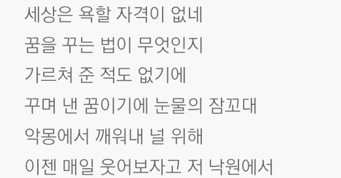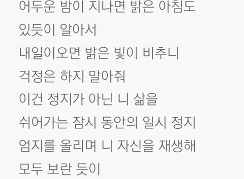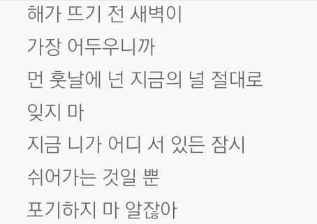 한달 뒤에 컴백이라 그런가 까글 진짜 많아진 것 같은데 다 사과하고 피드백 올리고 공부하기까지 가사 다 쓰고 컨펌 받는 아이돌한테 뭘 더 바라는 건지 모르겠는데 없었던 일이 되는 건 아니지만 진짜 나는 얘네 가사 때문에 위로 많이 받은 사람이라 고3 때 다 포기하고 싶었는데 나만 이런 감정 느끼는 게 아니구나 싶었던 게 슈가 정국 진이 부른 노래였고 아무튼 진짜 그냥 남기고 싶었어...