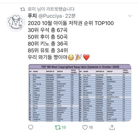 10월 순위에 군대간 조진호 미포함 8명중 4명 들어갔어 ㄹㅇ열일한다 울 페나건들 우석이가 순위 젤 높은것좀 봐... 조지노 보고있냐... 젤베 열심히 산다ㅠㅠㅠ 우돌이 지갑 두둑해져라 얇아지는건 윤희들만 할게.. 앨범이 그래서 얼마였더라