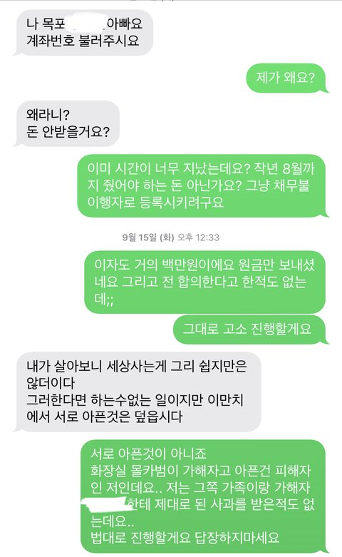 작년 3월까지 500만원 , 8월까지 500만원을 저에게 보내야 했지만 500만원만 입금될 뿐 그 뒤론 감감무소식이었어요
