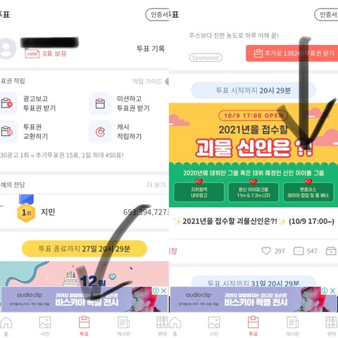 팬플러스 다운받고 내일부터 투표ㄲ 1. 팬플러스 다운 2. 로그인 후 투표버튼 누르기 3. 아래로 내리다보면 '2021 접수할 괴물신인'에 투표부탁할게 !