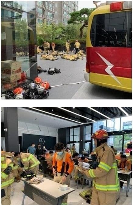 화재사고 난 아파트 옆에 벤츠 영업장 있는데 영업안하고 소방공무원 및 자원봉사자들 식사,휴식공간으로 제공했대