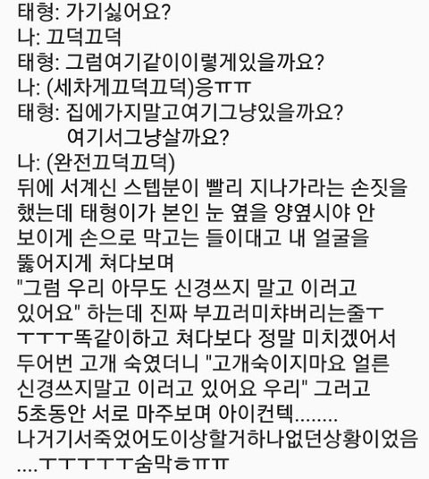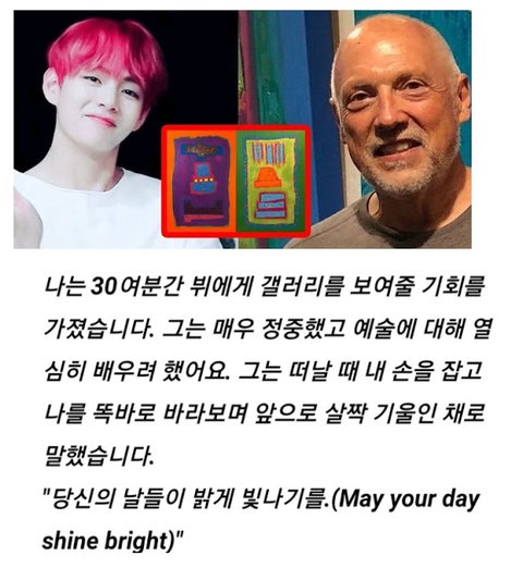김태형(방탄소년단 뷔) 씨가 생각했던 모습하고 많이 달라서 놀랐다. 만나기 전에 방탄소년단 뮤직비디오나 무대 영상을 찾아보면서 좀 센 사람일 줄 알았다. 근데 그런 면이 하나도 없는 것 같다. 사람이 정말 순한 것 같았다. 인사도 열심히 하고 말도 예쁘게 한다. 사람들이 다 예뻐했다. 평소에도 칭찬을 많이 들었을 것 같은데 사람들이 칭찬할 때마다 매번 너무 쑥스러워 하고 진심으로 고마워했다. 그런 모습들이 순수해 보여서 보기 좋았다.