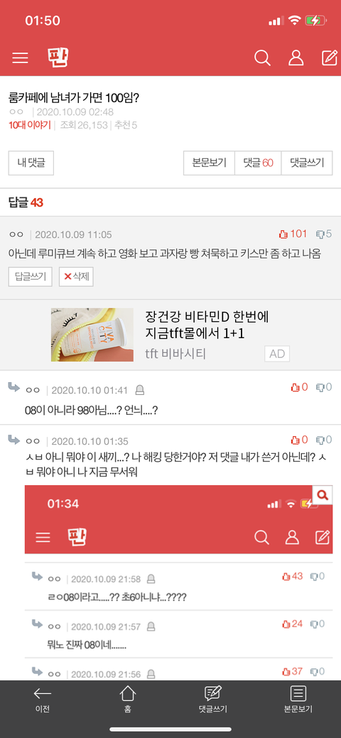 어떤 애가 나인 척 저렇게 올렸는데 저 답글 내가 쓴거 아니거든 나 해킹 당한거야? 소름 돋아 합성한건가? ㅅㅂ 일단 비번 어렵게 바꾸긴 했는데 그래도 찝찝해 내가 지금까지 쓴 글이랑 댓글이랑 내 이름도 알거 아니야