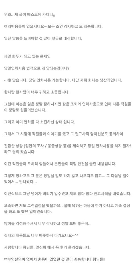 안그래도 당일연차사용한다고 짤린건가지금?하고 원글 찾아보니 추가 내용 있어서 가져왔어요 연차 다 사용했는데 어케 뭘로 쉰다고 배짱부린거지...
